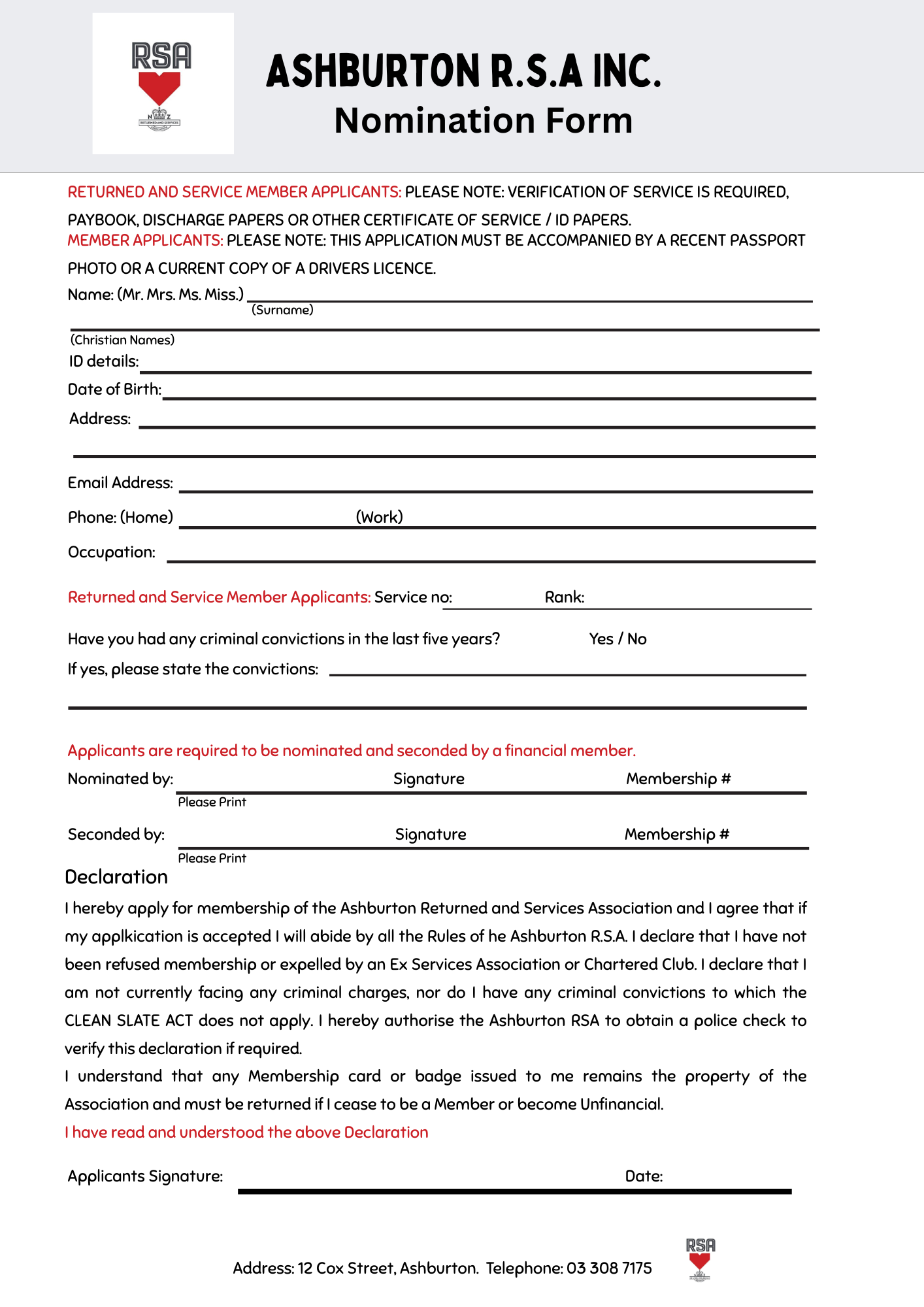 Membership is open to anyone over the age of 18 – joining the Ashburton RSA is the perfect way to meet new people and have a fun night out. You do not need to be a returned or serving serviceperson to join the club/ Ring the office on (03) 308-7175 and we can post you a nomination form, or pick one up at the club.